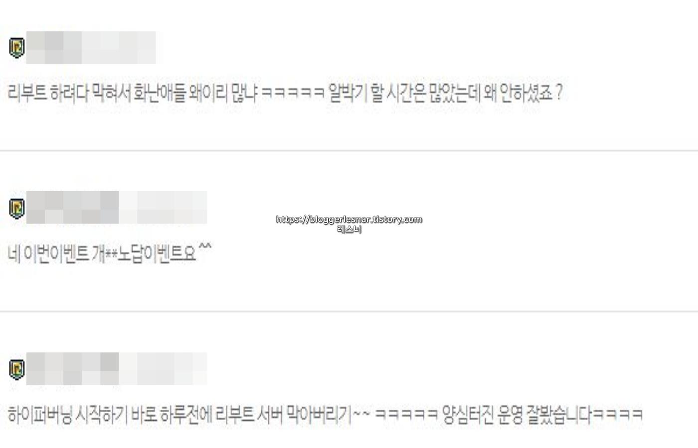 나머지 댓글들은 이벤트에 대한 불만족과 각종 논란을 겪었음에도 발전 없는 운영에 대한 비판이 대부분이었습니다.